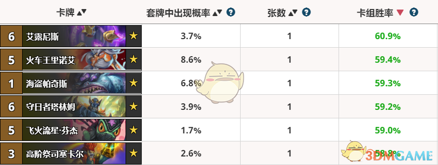 海盗帕奇斯在被削弱后扔到了狂野,想不到现在胜率也这么高了,在奇数贼,海盗战还海盗骑卡组中的强度都不错,相当于是场上白战了一个海盗,还压缩了牌库,就算没冲锋,他的作用也是非常大,从带他的卡组胜率都很高就知道这点了。