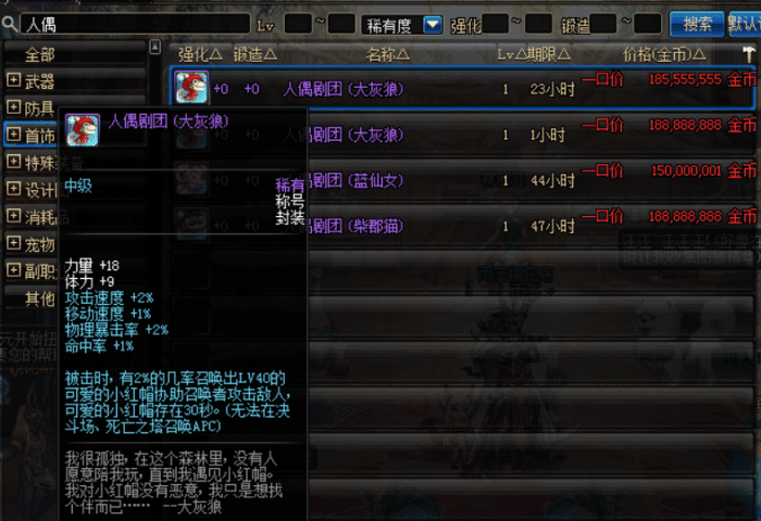 人偶剧场称号,人偶剧团套装中的称号,这套称号属性在当前的版本还有用,能召唤出人偶,作为单刷火山的称号,或许这称号还能派上用场。不过,这称号的价格有点“吓人”,拍卖行卖1.5亿,土豪才能用得起。