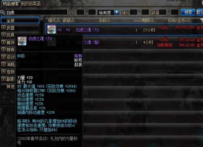 白虎之魂称号,曾经制霸地下城的称号,白虎称号当初一发售就引来狂潮,被称为当时最强的称号,拍卖行价格很昂贵。虽然在当前的版本,白虎的称号不强,但依旧能在拍卖行卖3.5亿游戏币,这恐怕唯有土豪才能买得起。