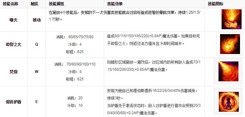 安妮是一个拥有超高爆发能力的AP英雄,QWR的高伤害能够瞬间让敌人蒸发;又加上被动技能“嗜火”的存在,再搭配其他技能,安妮就可以拥有各种各样的控制手段,是游戏中不可多得的输出与控制兼备的AP法师。