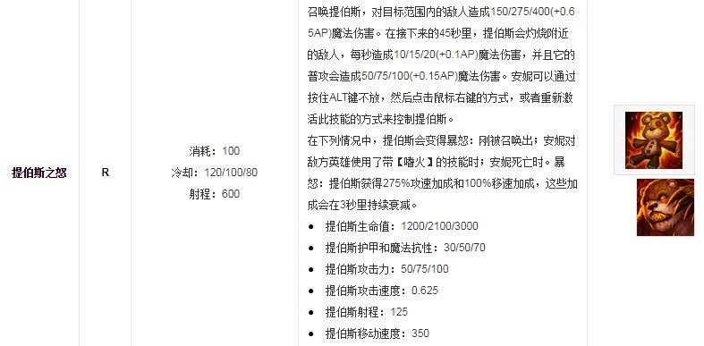 安妮召唤的巨熊提伯斯能烧伤他附近的敌方单位。切记远离被召唤出的提伯斯。