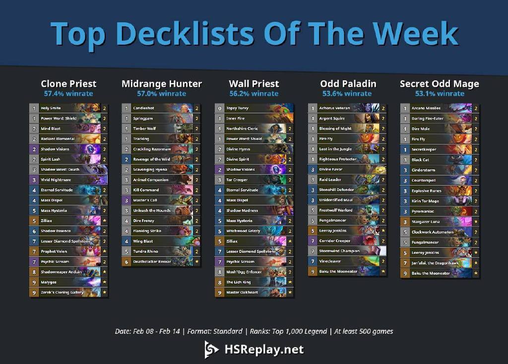 在炉石传说中,所谓天梯乱斗、神仙打架都是精彩发生的。在经过补丁和环境的变化之后,国外数据网站统计出了最近一周天梯传说前1000名胜率最高的五套卡组。下面我们就来看下在如此高的分段都是哪些卡组在掌控雷电。