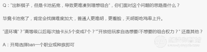 我对ban一个职业或者种族的看法,ban自己的一个职业吧,我ban战士肯定比ban萨满ban的有效果这样我更容易找到法师,刺客等职业,如果ban种族,我ban个6地精、7人类对找4巨魔有这极大的帮助,甚至产生质变。导致地精过于容易成型或者说成型过早。等一系列问题,紧接着就是一系列紧急修复(炉石玩家表示有补偿......发生啥了???)