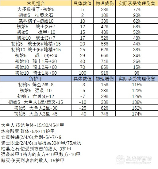 一层护盾的效果(骑士3个5甲3个10甲,以10甲来计算):实际承受物理伤害26%,实际承受魔法伤害25%(计算受到一层法师光环时为35%);