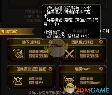 对于经常刷深渊的小伙伴来说,礼遇特权可以为我们额外增加一个异性碎片礼盒,内含5~10个异形碎片,相当于增加了50%左右的深渊异形碎片产出。