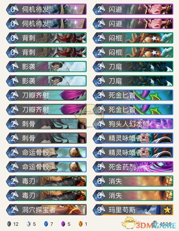 这套是目前主流的蓝龙贼构筑模式,在笔者看来也几乎没有什么可以调整得了,最多就是把一张刀扇换成暗影步,利用暗影步和精灵咏唱者配合,以2费再刷2张卡,而刀扇却不是说舍弃就可以舍弃的,除非遇到奇数骑和猎人特别少,否则还是不推荐卸掉一张刀扇,当然也可以换成一张血法师,这样不仅是狗头人幻术师、死金匕首,就还有了血法师这张亡语可以和骨骰配合。