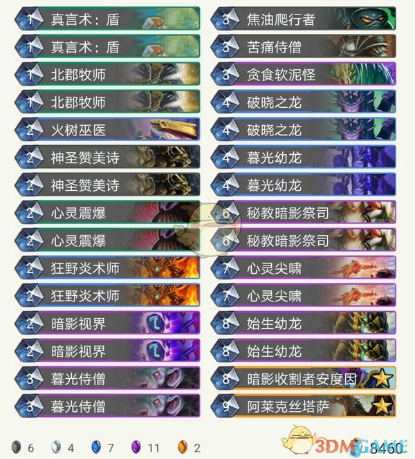 漫展牧:这个对局我们需要前期用暮光龙多给到血量上的压力,暮光侍僧可以尽快的交换对手暗影精华那一波的5/5随从,不然前期是没什么场面的。这个对局很关键的点在于红龙和DK,我们要尽快变DK去压低对手的血量。如果对手使用了钻石复活,我们就用尖啸就好,后期需要注意的点在于场面随从不用上太多,如果吃对手维纶鞭笞回血就很麻烦了。