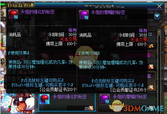在公会NPC皇室补给兵安德处,可以兑换两种道具。一个是永恒的强化秘密,需要20个公会贡献证书,效果持续30分钟。一个是永恒的增幅秘密,需要35个公会贡献证书,效果持续30分钟。这两个道具分别是增加强化和增幅的概率的,想要增加强化增幅概率,这两个道具是必备的。