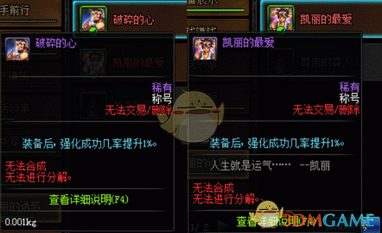 第二个是凯丽的最爱,需要强化+10以上成功30个装备,要求紫装以上品级。如果没有这个成就的玩家可以考虑和破碎的心一起做,买几个+10的防具首饰假紫,慢慢强化好了。两个称号有一个就行,都是增加1%的成就概率的。