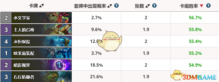 石丘防御者的出场率是最高的,在奇数任务战中可以算得上核心了,既能防守,又能加快做任务的进度,而在其他很多卡组中同样出现得很频繁,不仅各种防守控制卡组喜欢用,一些快攻也要用他来保护其他随从,正因为出场率高,所以胜率并不是很高。