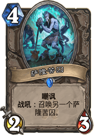 虽然字面描述被改,无法享受二王子的buff,萨隆苦囚仍然是一张优秀的单卡。四费萨隆苦囚,五费菌菇术士一架可以让我们的场面瞬间膨胀起来。是一个强力的节奏点。