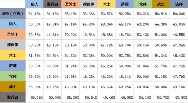 通过对局胜率表我们也可以得到一个事实:法师目前的表现是最好的,在对阵所有职业时,都具有一定的压制性,出色的英雄技能和优质的法术让这个职业长期处于顶尖水平。