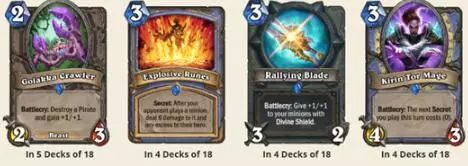 卡组类型分布我们可以看到法师都是携带的奥秘法,萨满则是三个偶数萨,一个沙德沃克萨,骑士则是三个奇数骑,一个快攻骑。