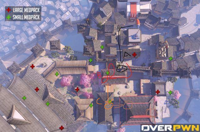 花村的B点则对队伍的执行力有着更高的要求。首先是非常常规的沿着进攻方右侧的路线进入到三楼,在这个过程中大锤和DVA一定要注意阻止能对队伍造成威胁的东西。进入到三楼这个开阔平台以后,大锤需要注意对方长枪的位置来举盾,而其他人则需要将站在三楼的敌方英雄赶下去。需要注意的是,三楼同样的是一个非常容易被砸禁疗的地方,DVA请时刻关注对方安娜的举动。 之后全员不应该选择直接跳入点中,而是沿着楼梯走向防守方出生点。到达出生点一楼之后立刻DJ大加速向远处的出生点冲去,因为这时对方的输出位很可能已经换位到对面的二楼平台,所以过程中同样要保持着举盾。这样做的目的是把平时会待在这个出生点拐角的安娜/和尚逼迫回出生点,使得点上敌方无法及时获得治疗。将人赶走之后立刻进点,进行谁进点打谁的过程。这个点因为比较开阔,点内基本完全暴露在对方高台的火力之下。这队全队的协调性和清人效率有着较高的要求,需要在己方被消耗的减员之前对敌方踩点英雄造成击杀。此时DVA可以适当的飞向高台对对方输出位进行限制,但切记在没有100%击杀的把握下不可深追,目标点才是第一位。锤妹除了在点里盾击以外,还可以举盾躲在出生点的拐角处,当对方安娜/和尚企图走回来帮助队友时对其造成击杀。