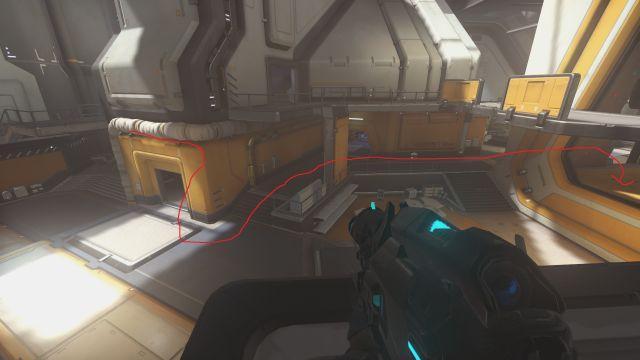 这是这个点最为常见的一种拉点方式。出生走左边以后,在小房间里稍加整顿便大加速直接向点中冲去。这样的优势是拉点距离是所有方法中最短的,所以暴露在敌方火力下的时间也是最短的,路上甚至还有几根柱子作为掩体。在大锤举盾的情况下,此方法可以基本忽视对方的远程火力,唯一需要注意的只有对方奥丽莎的吸和安娜的禁疗了。需要注意的是,此方法拉点的过程中无论对方什么英雄前来阻挠,都应该基本上无视的向目的地冲去。很多人在路上看到对方猩猩落下来就会停下来集火猩猩,但这样做的同时会让全队密集的暴露在对方远程火力之下,非常容易造成减员,因此一定要先到达目的地再与对方进行交战。