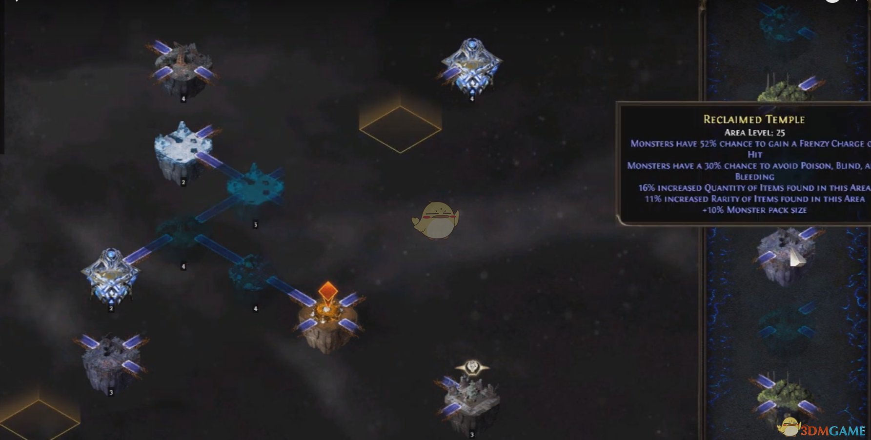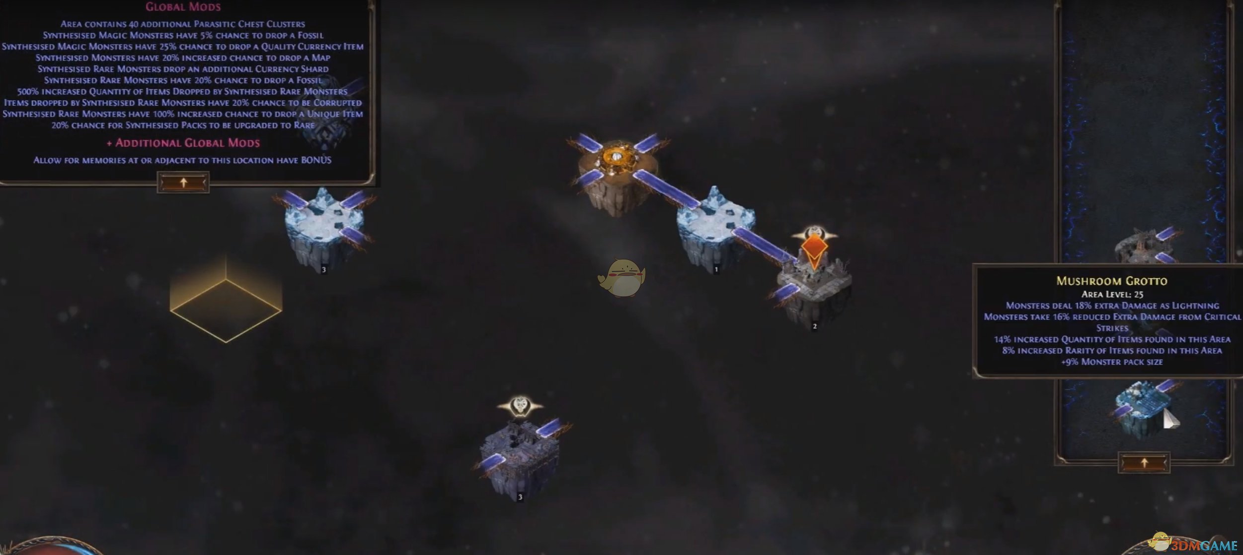 每个放置的记忆棋都会有一个战棋全域词缀, 这在左上方粉红色区域可以看到. 一次放置5个记忆棋就会新增五条全域词缀. 全域词缀让你在虚空棋盘上都可以受益.
