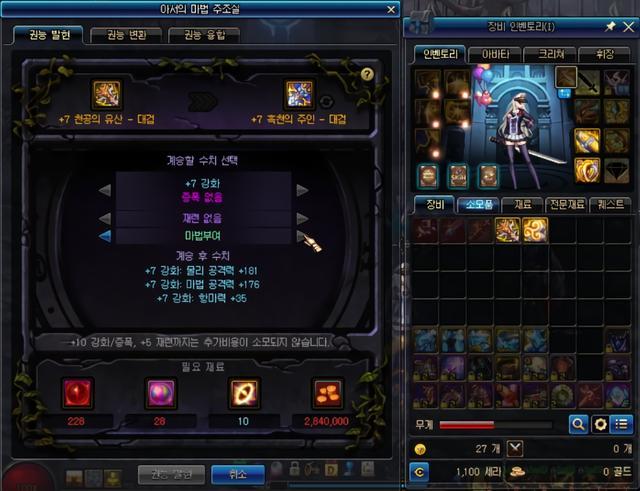 武器升级需要注意的是,强化或者增幅10以上,锻造5以上需要交额外的金币,并且可以选择是否保留这个强化增幅锻造,所以目前大家百分比职业就不要浪费钱去锻造加战力,固伤职业就别没事把+13的强化券打在苍穹武器上,要不不仅浪费材料,还浪费钱~~保留附魔是70万,图示是+12的属强附魔,至于卡恩之类的还不清楚。如果毫无保留的,升级是214万。