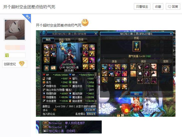 这位奶妈玩家今天在申请打超时空的时候就遭受到了来子一位膨胀主C的嘲讽,别人申请入团却被主C嘲讽是来当酱油的。首先我们看一下他的面板,5000智力而且祝福等级也还算比较不错的,虽然登记有点鬼才,但至少比超时空门槛奶强很多。玩家申请只是为了普普通通的打次团,谁知主C竟然张口就来,直接说别人是来当老板的。
