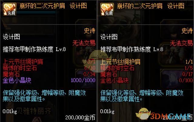 B套升级使用的材料也大幅度的减少,精炼的时空石只需要5个,金色小晶块只需要100个,减少了9/10,而魔岩石数量直接减少了一半,现在只需要17个就能升级一件,这意味什么?5件套低保的情况下,只需要3.5周的时间就能全部升级,一个月升级一套,辛辛苦苦升级的B套不如别人一个月~~难受~~