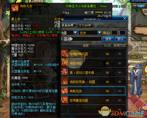 第二个是一把鬼剑士武器:钝器名为有教无类,在所有输出系哈林史诗武器中,这无疑是最强力的一把,属性简单粗暴,66%的黄追和10%的技能攻击力,在不冲突时提升达到了1.826,完全碾压圣耀,即使存在少量黄追的稀释属性,这把武器的提升也是领先圣耀仅次于苍穹的,所以如果有小号红眼的玩家完全可以选择这把武器。