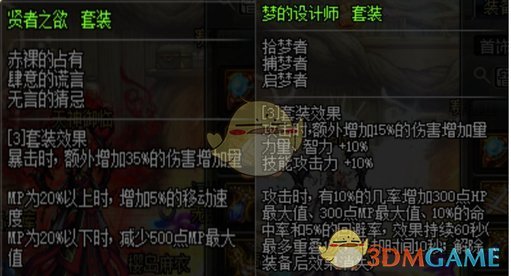 由于每22点属强约提升百分之10的伤害,因此表面看上去两套的伤害加成是一样的。但实际上呢贤者之欲套的加成类型并不如另一套多,所以在提升率方面存在稀释的情况。值得注意的是贤者之欲有着极高的三速加成,非常适合小号刷图搬砖用。梦的设计师伤害加成类型较多,稀释较少且有暴击加成,适合想去打团成长的号。