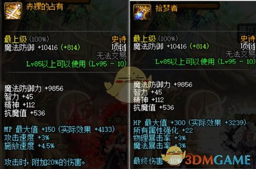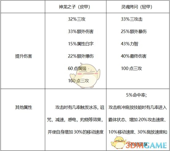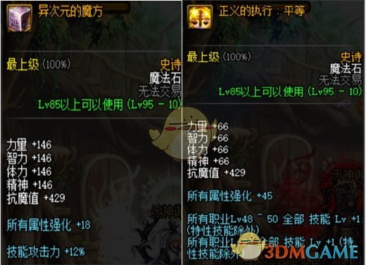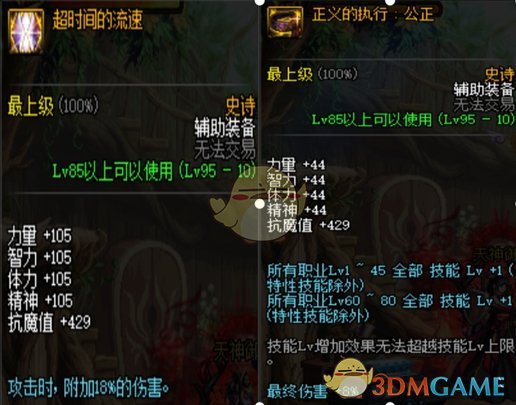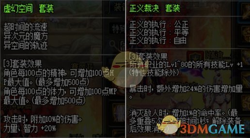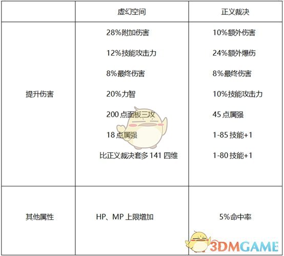 由于四维和双攻加成比较多,显然面板不高职业基础较低的职业选择虚幻空间能拥有更大家的提升率。而正义裁决套装由于有技能等级的加成,更适合诸如复仇者、天帝等拥有多个被动技能的职业,此外它的5%命中率加成,在某些时候也能起到关键的作用。