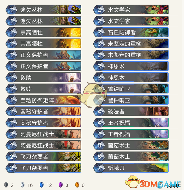 这副牌是非常非常便宜的卡组,甚至可以0传说。上面这个是我改成纯蓝白卡的组法。甚至我认为这样组根本没有比较弱。最重要的警钟哨卫、奥秘守护者+奥秘体系都没有受影响,甚至多了一张迷失丛林搭配飞刀、菌菇,让前期更容易打赢场面。