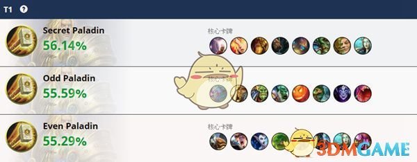 根据HSreplay的统计,目前天梯胜率前3名的卡组都是圣骑。从第一到第三名分别是奥秘骑、奇数骑、偶数骑。奇数骑受益于德鲁伊的殒落和猎人的大量出现,能够成为T1强牌十分合理。不过奥秘骑就很令人惊讶,毕竟他是一副完全新出现的套牌,就直接变成了T1的第一名天梯最强牌,非常惊人。