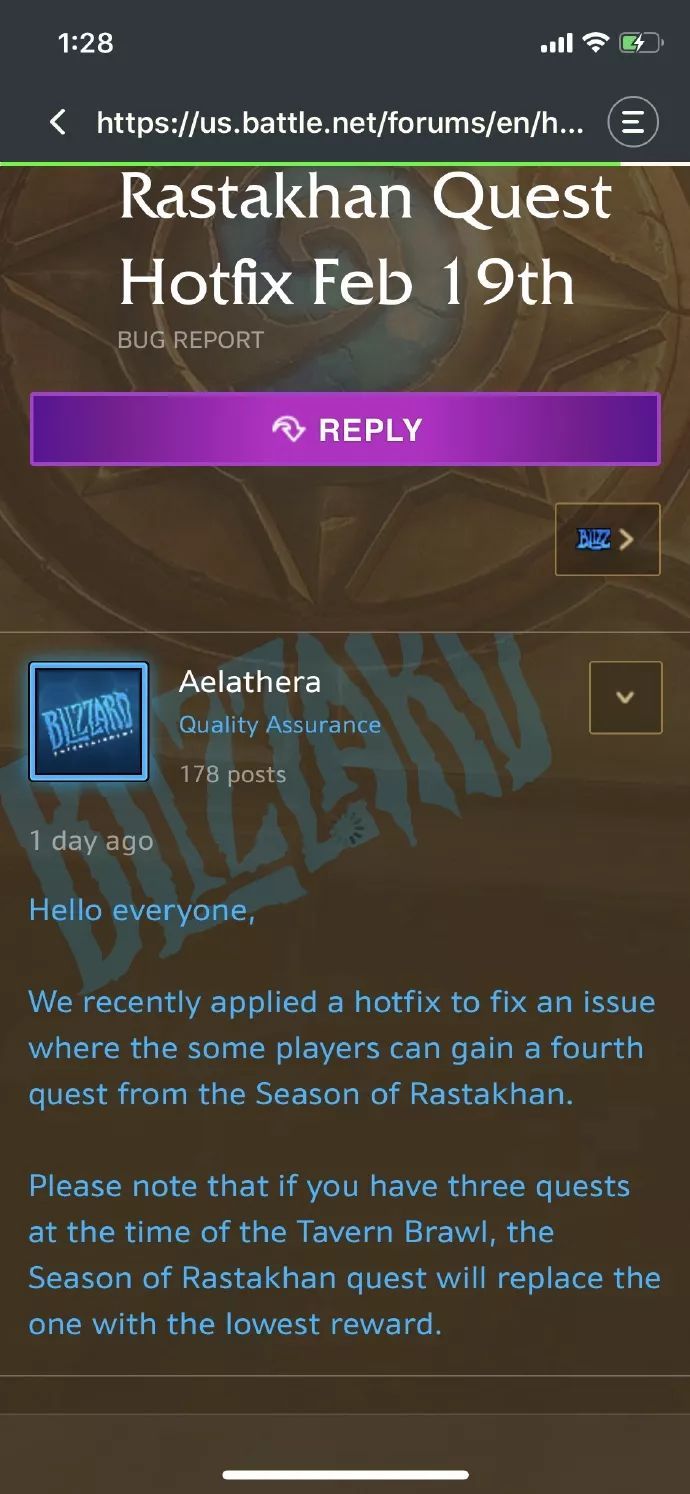 炉石传说是一款非常火爆的卡牌游戏, 游戏中拥有非常深的卡排池,形态各异的11个独特英雄,还拥有非常多的游戏机制与玩法系统,是一款非常精品的卡牌游戏,也是目前暴雪旗下的招牌游戏之一,下面就一起来看看最新的暴雪修复4任务BUG消息吧。