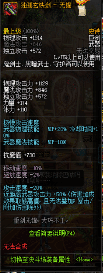 不过最近有网友说90版本 75SS 玄铁剑 用到死。 无能能替代 自身力量+170 ,近距离攻击力+50% 面板物理攻击都比 90SS 王者圣剑还高 ,拿还打个毛,基础属性碾压90级史诗武器啊。