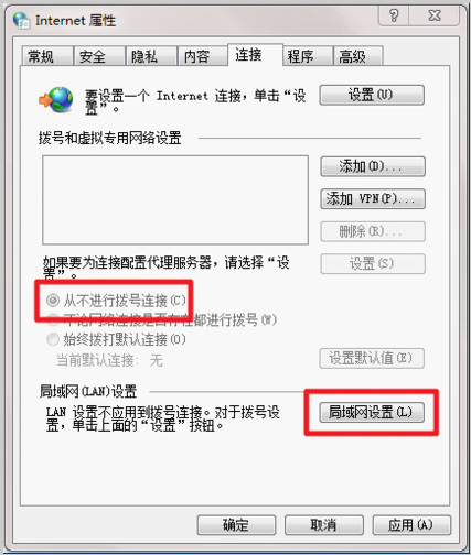(2)、点击连接标签确保选中 从不进行拨号连接