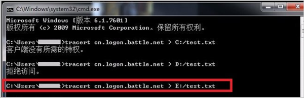 3、若按下回车后,提示客户端没有所需的特权或者拒绝访问,可以尝试将目标地址修改为其他盘符,如tracert cn.logon.battle.net > E:/test.txt