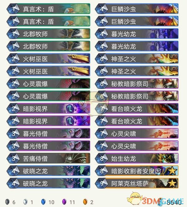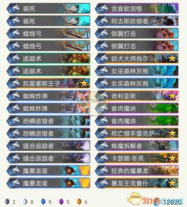 控制龙牧,除了打战士不太好打外,其他卡组均能一战,这套卡组的返场能力非常强,单解很多。群体AOE也丝毫不缺,打猎人起手找破晓龙就赢了一半,DK是用来打一些术士和法师的,需要持续压制对方的血量,等待震爆斩杀。