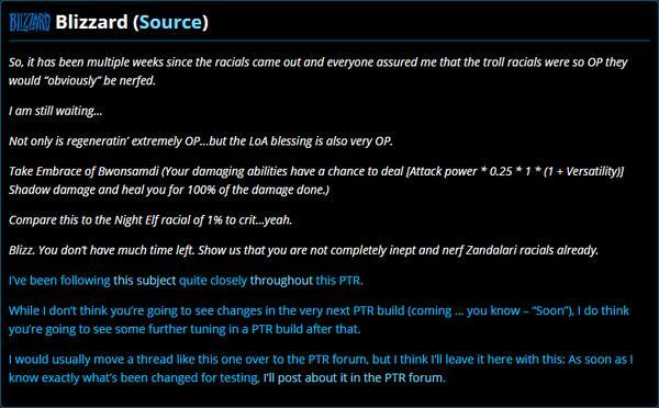 随着8.1.5版本上线时间越来越近,赞达拉巨魔种族技能是否会被修改也成为了玩家关注的一个点。今天官方通过蓝贴确认了会对其进行修改,但并不会在下一个PTR补丁中上线。