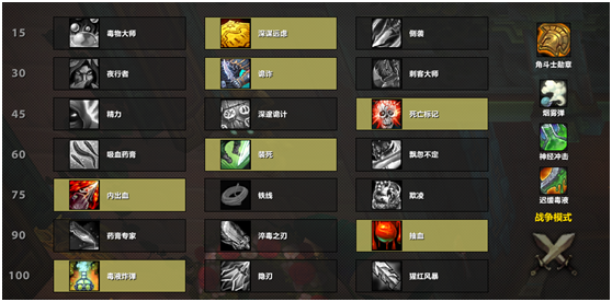 其实奇袭贼两个常规天赋主要是倒数第二行天赋上的区别,选择淬毒之刃或者抽血。淬毒这套天赋使用大多数的情况,如果是遭遇生存猎时可以将毒物大师更换为深谋,而遇到贼法组合时,神经冲动更改为疾跑。