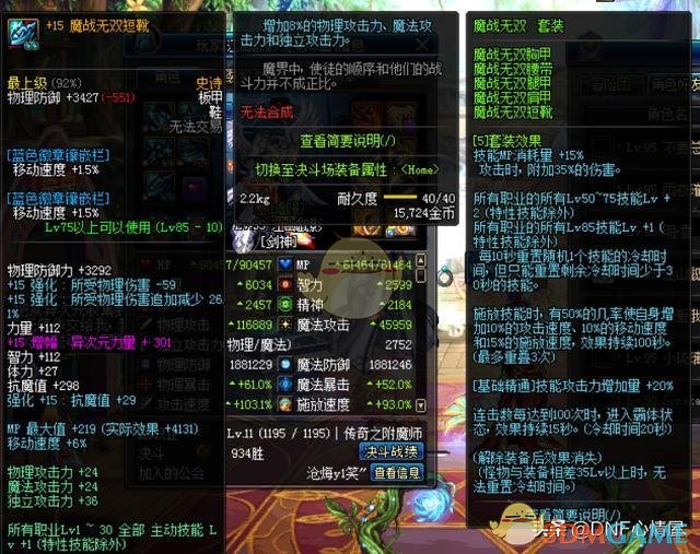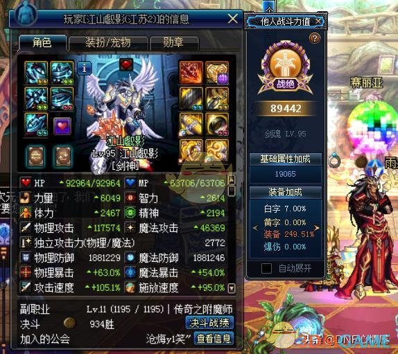 这位剑魂来自江苏2区,其左边身穿的是魔战套5件,手拿红彤彤的圣耀救赎光剑,95A特殊装备三件。魔战套剑魂,站街6049的力量,11万的物攻面板。剑魂身上的魔战套,被打造的很强势,鞋子是增幅15,其余的四件是增幅14,在跨五被誉为第一魔战剑魂。