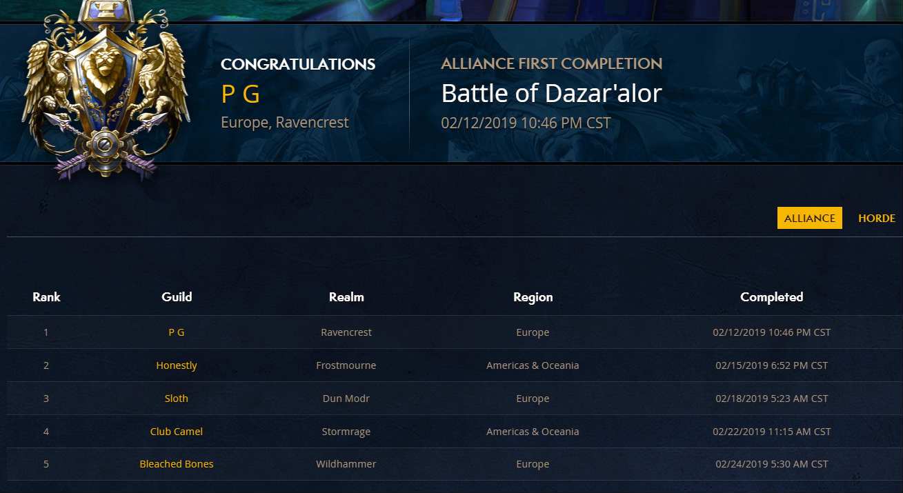 这项成就被分成联盟和部落两个版本,也就是说,联盟和部落的前100是分开计算的,只有名人堂双方前100同时完成,游戏才会开放跨服史诗模式。