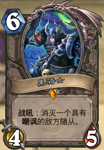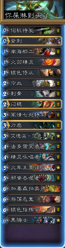 emmm,扯得有点远了,说说这个卡组的思路吧,通常情况下1费有怪就下,2费挂个刀,3费裸下军七?空打刀扇?4费就开始了!这节奏打牧师挺好的,但是打奇数骑就难了,铺场太厉害,前期手里有刀扇好过点,没有就基本没了,其他骑士就看节奏吧,还是有机会打赢对面的,但面对太厚的卡组就显得有点无力了,比如无限战,天启骑等。