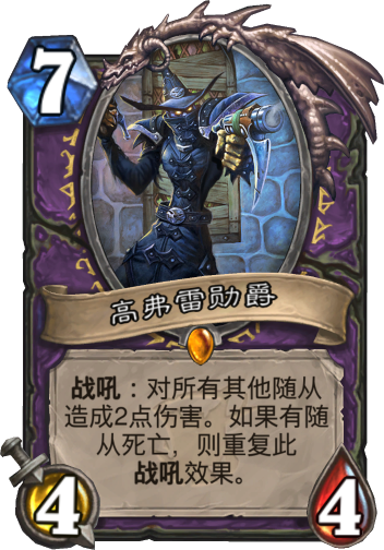 榜首则是高弗雷勋爵,一张术士的AOE卡,这张卡最强大的地方就是连续打2的伤害让对手无从防御,一般面对术士的时候,对面可能会防一下亵渎,毕竟橙卡不常见嘛,那勋爵就能在大多数情况下完成解场加站场的重任了,这样翻盘的局数不胜数。
