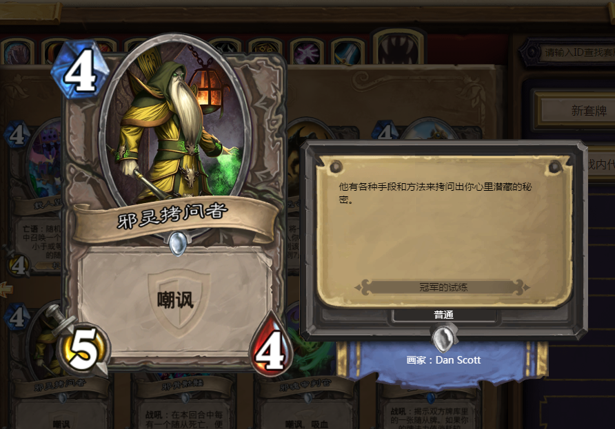 暴雪史上最嘴臭的一张卡组,邪灵拷问者除了本身4费5-4的身材之外,最令人印象深刻的就是其登场就骂人(你臭得像个麻风侏儒)的神奇音效。甚至一度有人围绕这张并不实用的白卡组过一套专门以辱骂其他玩家为主的“骂人盗贼”卡组,暗影步和夜幕,一回合骂三遍把对手的心态打崩!