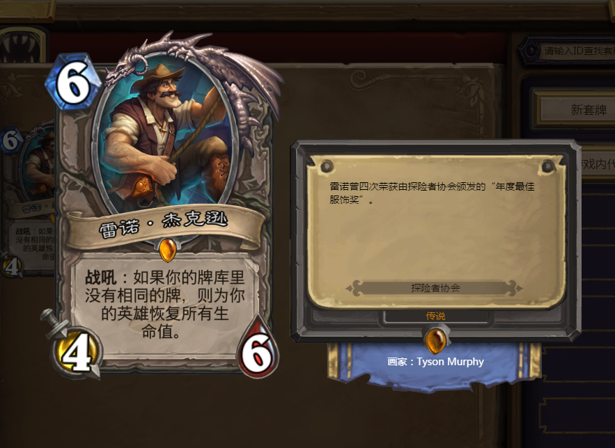 雷诺杰克逊作为一张曾经统治天梯对决的橙卡,随着他那句“我们要发财了”语音降临的是,令快攻绝望的超强奶量,直接将自己满血复活!不得不说这场橙卡是当时探险者协会最成功的设计,直接改变了当时天梯快攻横行的局面,将控制卡组推上了巅峰,而且宇宙系卡组最大的特点更在于30张各不相同的卡牌,玩家往往能打出出其不意的效果!
