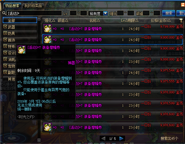 在时光之约活动中,第四次是有机会得到活动送的增幅卷的,这个几率比较小但不代表没有,从拍卖行这个道具的数量就可以看出,还是有相当一部分玩家开出了这个增幅卷,从+7到+10的范围内都有。那么问题来了,既然这次是以活动形式送给玩家的可交易道具,而且拍卖行仅仅只有5页,与魔盒开出道具的处境大不相同,那么是否会跟之前黄金增幅书产生较大区别,上演商人倒牛奶的事件呢?