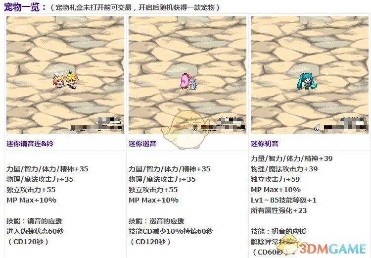 DNF在3月7日将会为大家带来新的礼包,这次礼包主题是曾经在外服上线的初音联动礼包。该礼包有很多宠物,例如迷你初音、迷你巡音、迷你镜音连&铃。那么这三种宠物属性怎么样呢?外观如何?下面就为大家带来这三种宠物介绍。