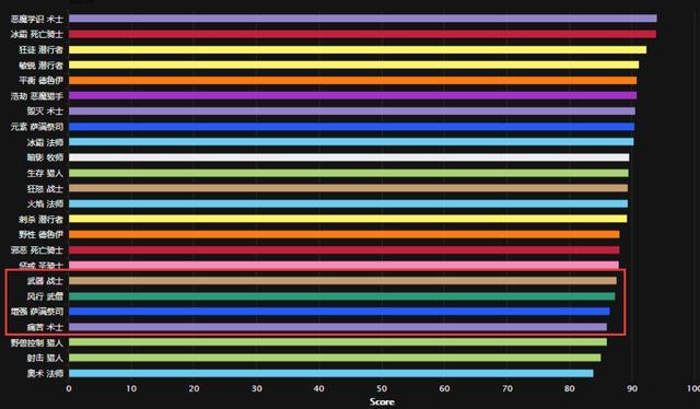 为此最近WCL统计了目前版本在奥迪尔团本和大米职业的专精评分,并将其做成了一个榜单。奥迪尔团本榜单咱们先且不提埋个伏笔,先说说大米专精榜单,前三甲全是明晃晃的黄色职业盗贼,等于一个职业占据了大米输出前三的位置,而再看看排与末尾的职业们,奥法、射击猎就不说了,SS常年无门票也不算,增强萨和武器战这俩是个“神魔恋”职业。