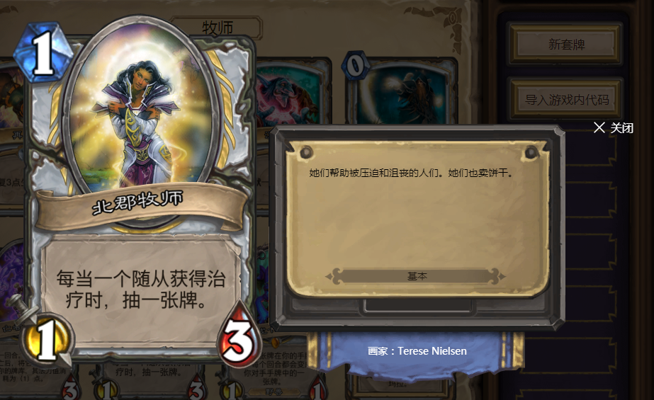 1费1/3的身材十分不错,大多数牧师职业的最爱。前期可以用来帮助清理一些小怪,当被治疗时还能用来过牌。可以说是非常良心了,1费随从中,她也算得上是众多小弟中的战斗机。