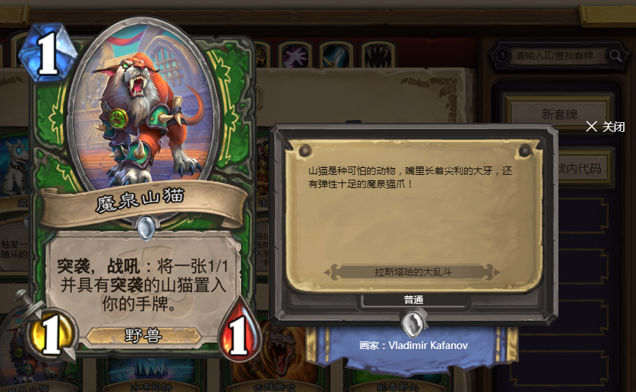 效果是将1只带突袭的山猫置入手牌,很多时候我们都配合土狼加攻加血,甚至还能用来解场。如果能搭配上猎人的一些BUFF牌,能起到非常好的效果。简直可以将他称为神卡了。而且最关键的是他只需要1费,解场,还能起到一定的威慑作用,逼迫对方解你的牌,能起到非常不错的效果。