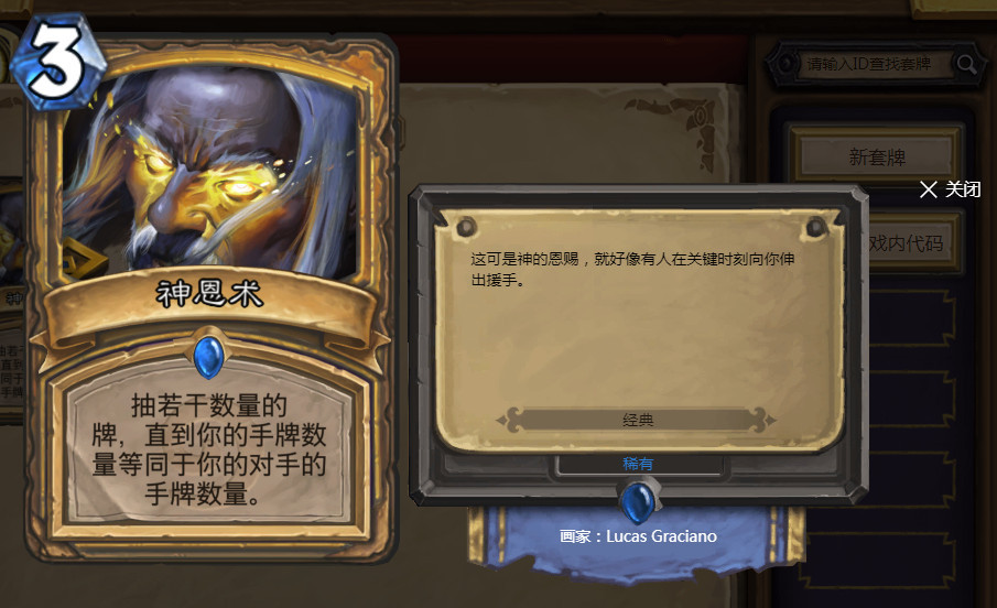难道你以为快攻骑只有奇数骑么?那么你一定太天真了。因为玩家们的开发,各种快攻形态的圣骑得以和大家见面,而神恩术因为能有效补充手牌,所以基本各大快攻骑都会带上一张。但是,这下它被送进荣誉室了,恐怕这套快攻体系要暂时和大家说再见了。