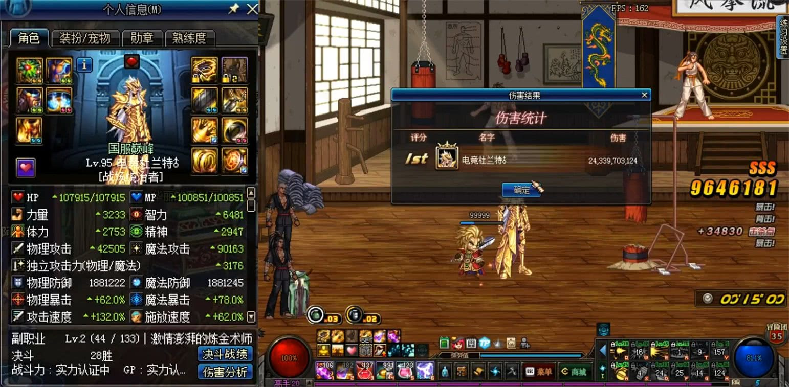 弹药的装备跟念帝有点不同,三神器还没有升级95A,但是其他都一样,一身增幅14,武器增幅15,在15秒沙袋测试的时候,最好成绩是243亿,屈居第四名。