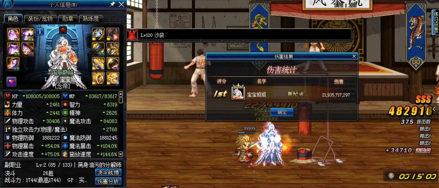 众所周知,红眼是旭旭宝宝的大号,那么这个职业在15秒打沙袋的时候如何呢?在旭旭宝宝一身装备还有四件未完成增幅16的情况下,最极限的输出是323亿,略微比鬼泣多上一亿,排在第二名。