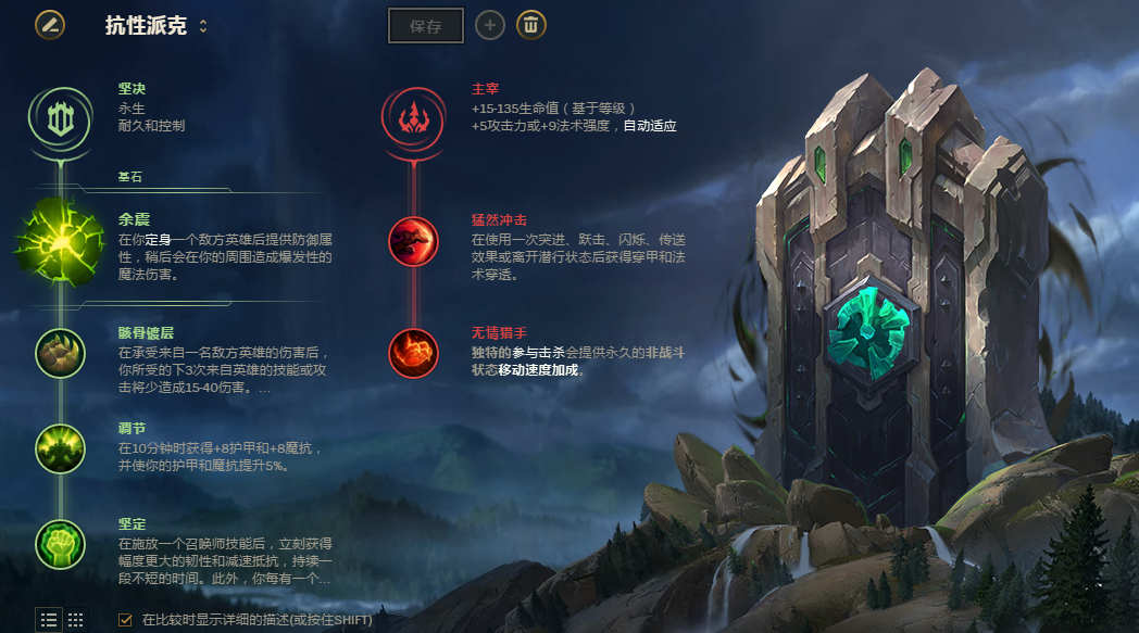 符文方面,既然是抗性派克,符文就放弃了电刑,转为余震,Q技能和E技能都能触发,效果也不错,需要注意的是,小符文尽量不要点和生命值相关的,收益会比较低,用骸骨、调节、坚定就可以了,副系选择主宰系,猛然冲击和无情猎手依然是最好的选择。